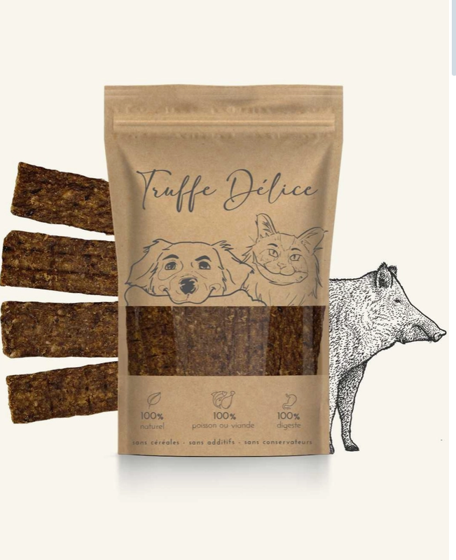 Avec Ryo, notre bouledogue au flair affûté et à la mâchoire de compétition, les friandises passent rarement l’épreuve du goût ET de la texture. Mais les lamelles de sanglier ? C’est une autre histoire.